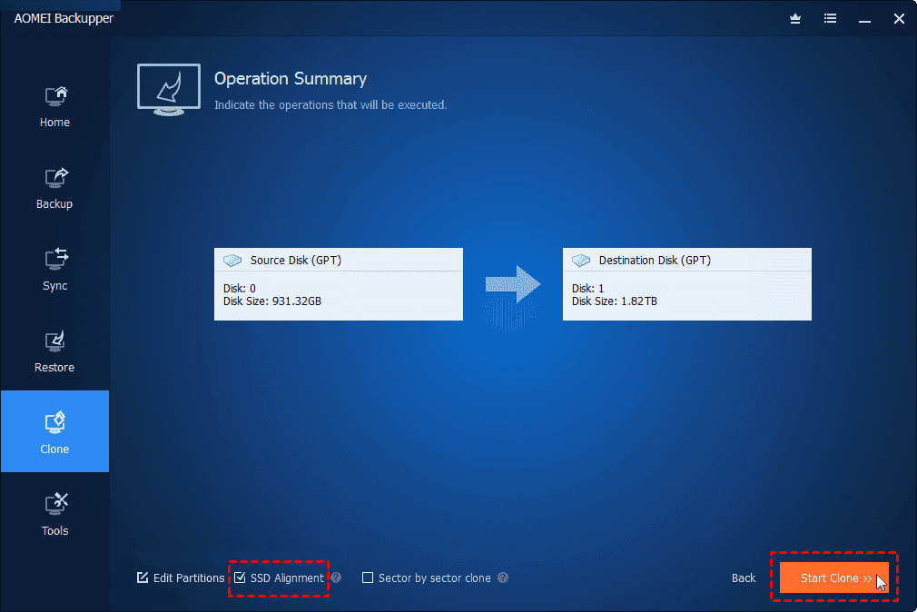 Step 4. Check SSD Alignment option to improve the writing and reading speed of SSD disk, then click Start Clone.
